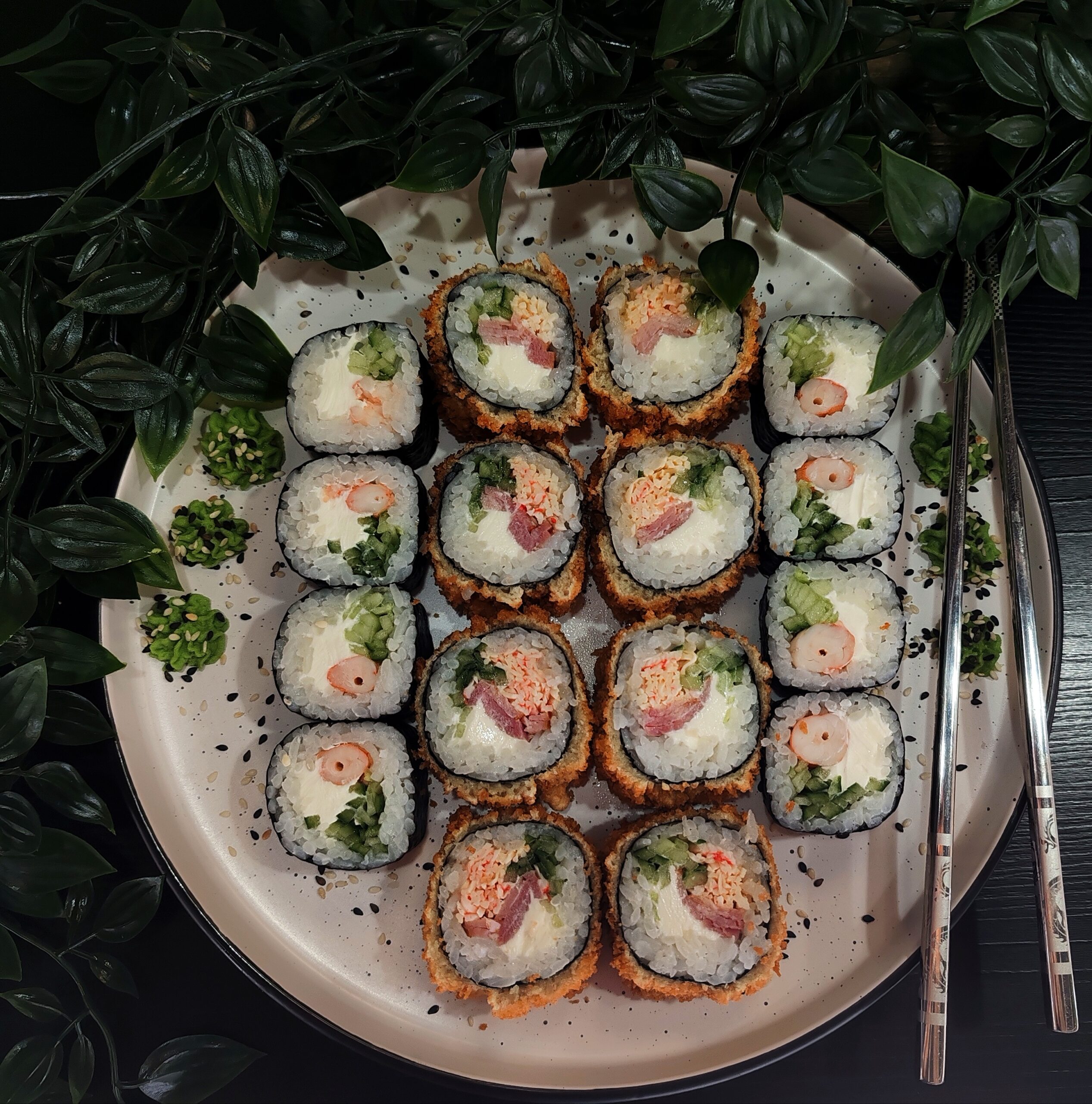 Ролл с беконом и тартаром из снежного краба (бекон, тартар из снежного краба, огурец, сыр, смесь темпура, сухари панко, соус спайси)