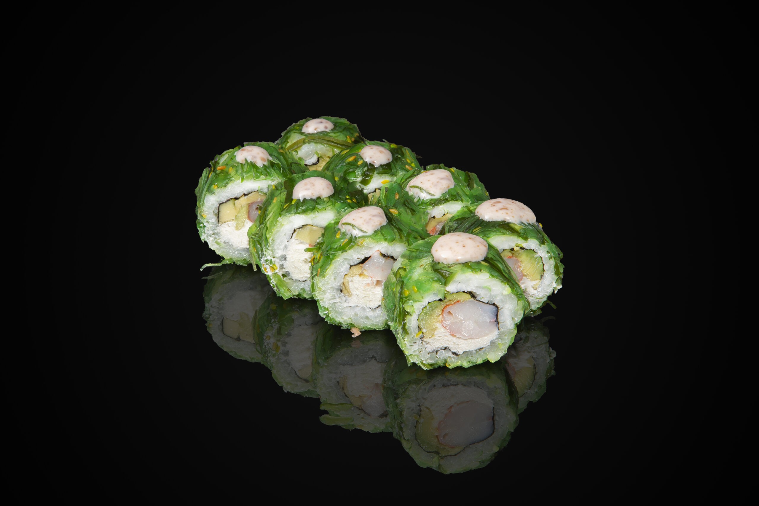 Рис, нори, сыр, креветка, авокадо, чука салат, ореховый соус