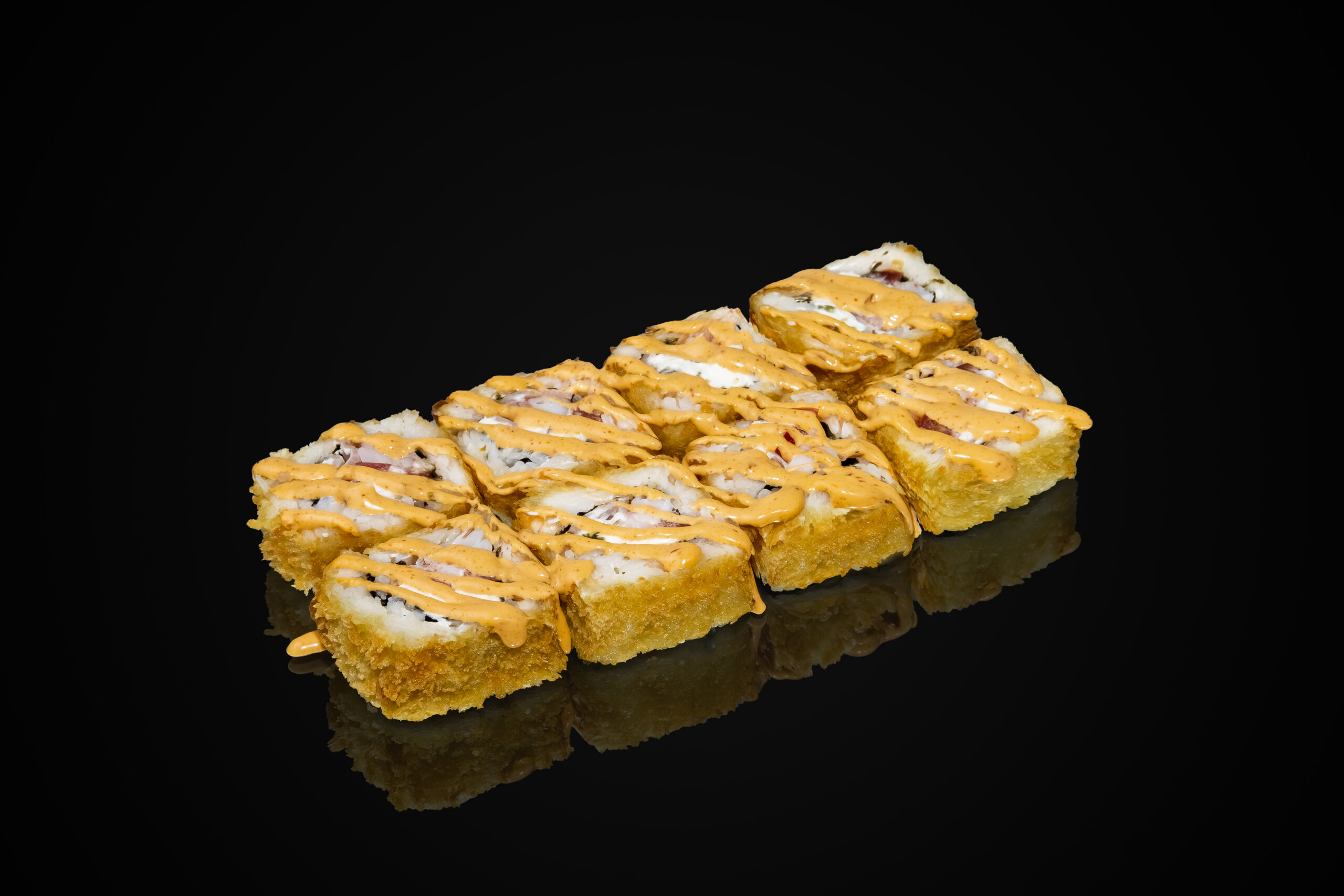 Рис, нори, сыр, опаленный бекон, креветка, помидор, панировка для горячего ролла