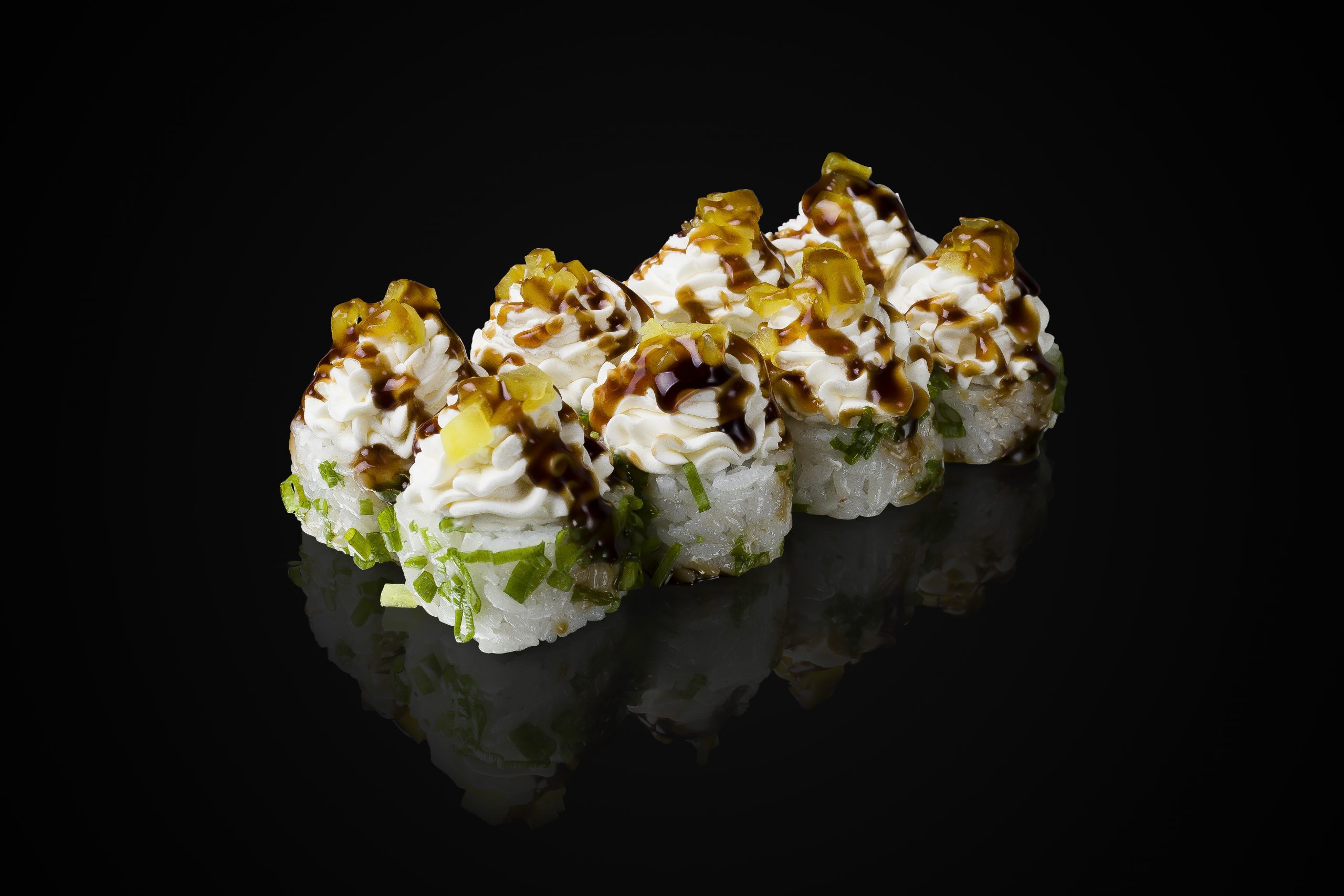 Рис, нори, жаренный лосось, салат, майонез японский, лук зелёный, сыр сливочный, такуан, соус терияки