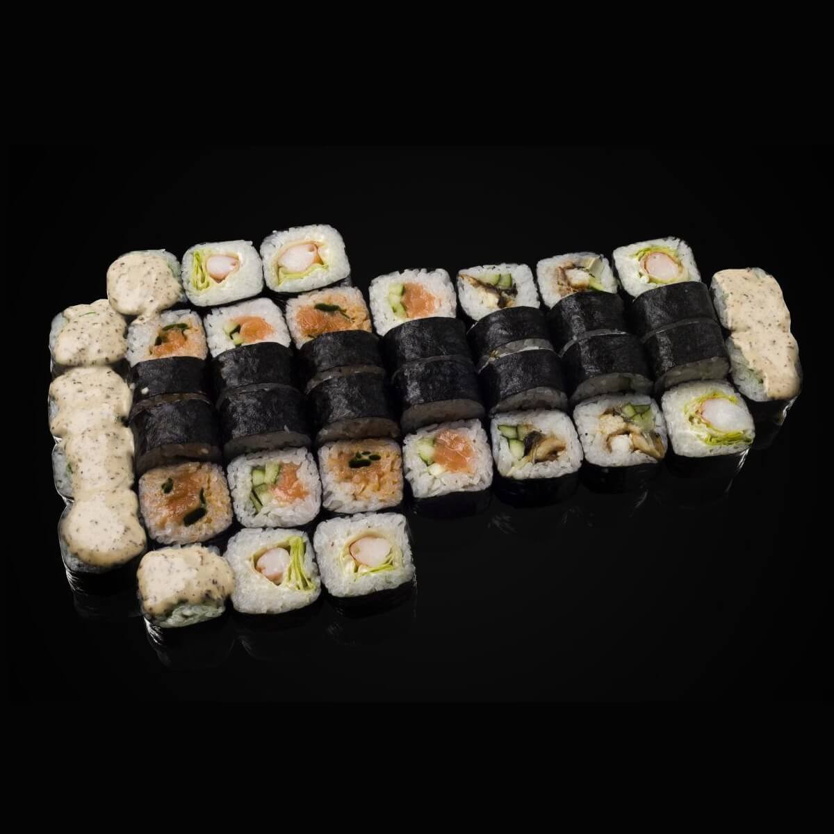 » Спайси кунцей» маки ( 8 шт), «Сяке маки» ( 8 шт), «Эби маки» (8 шт), «Унаги маки» ( 8 шт), «Чука маки» ( 8 шт), соевый соус