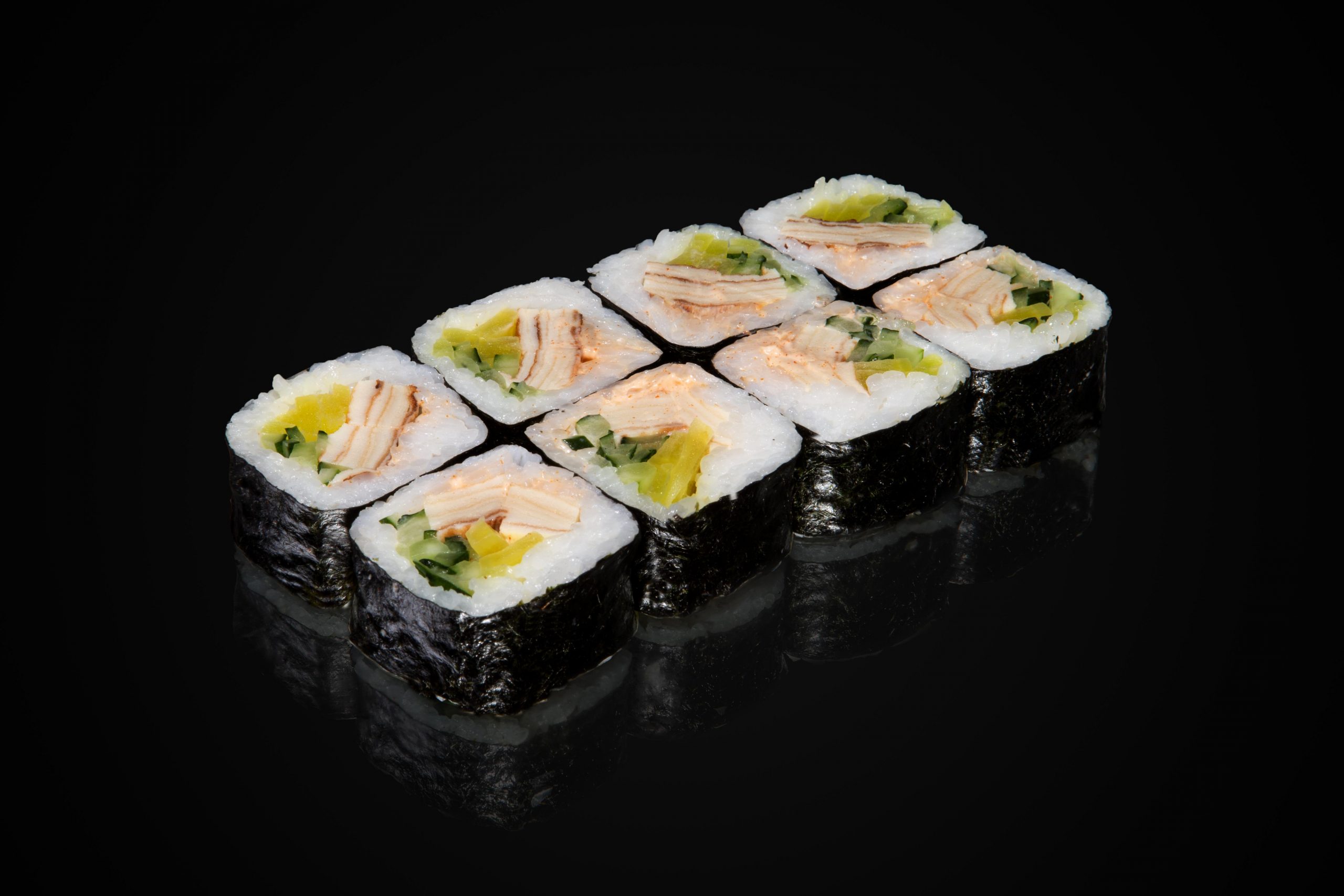 Рис, нори, острый соус, огурец такуан, омлет тамаго